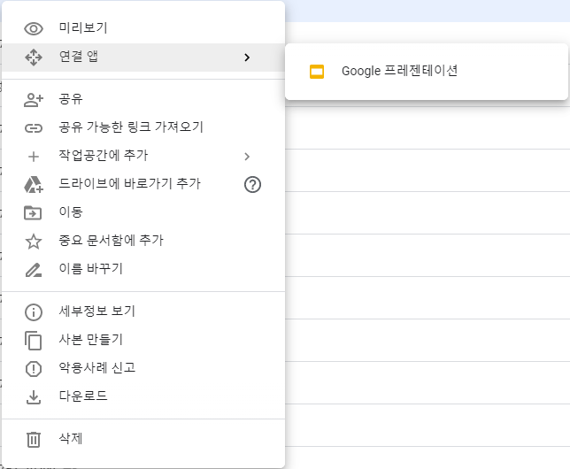 구글 드라이브에 있는 프레젠테이션 파일을 마우스 오른쪽 버튼을 클릭하여 '연결 앱'-'Google 프레젠테이션'을 클릭하여 열어줍니다.
